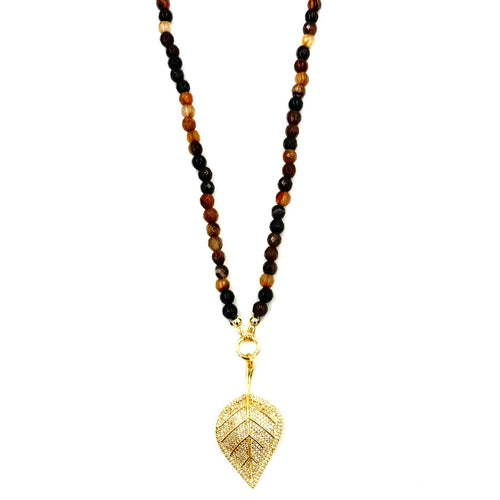 Ashley Gold Stainless Steel Gold Plated Brown Beaded CZ Leaf Detachable Pendant Necklace