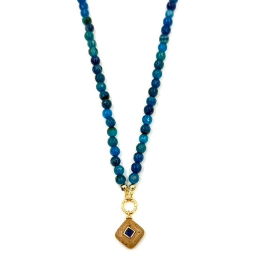 Ashley Gold Stainless Steel Gold Plated Blue Beaded Necklace With Square Enamel Charm Necklace