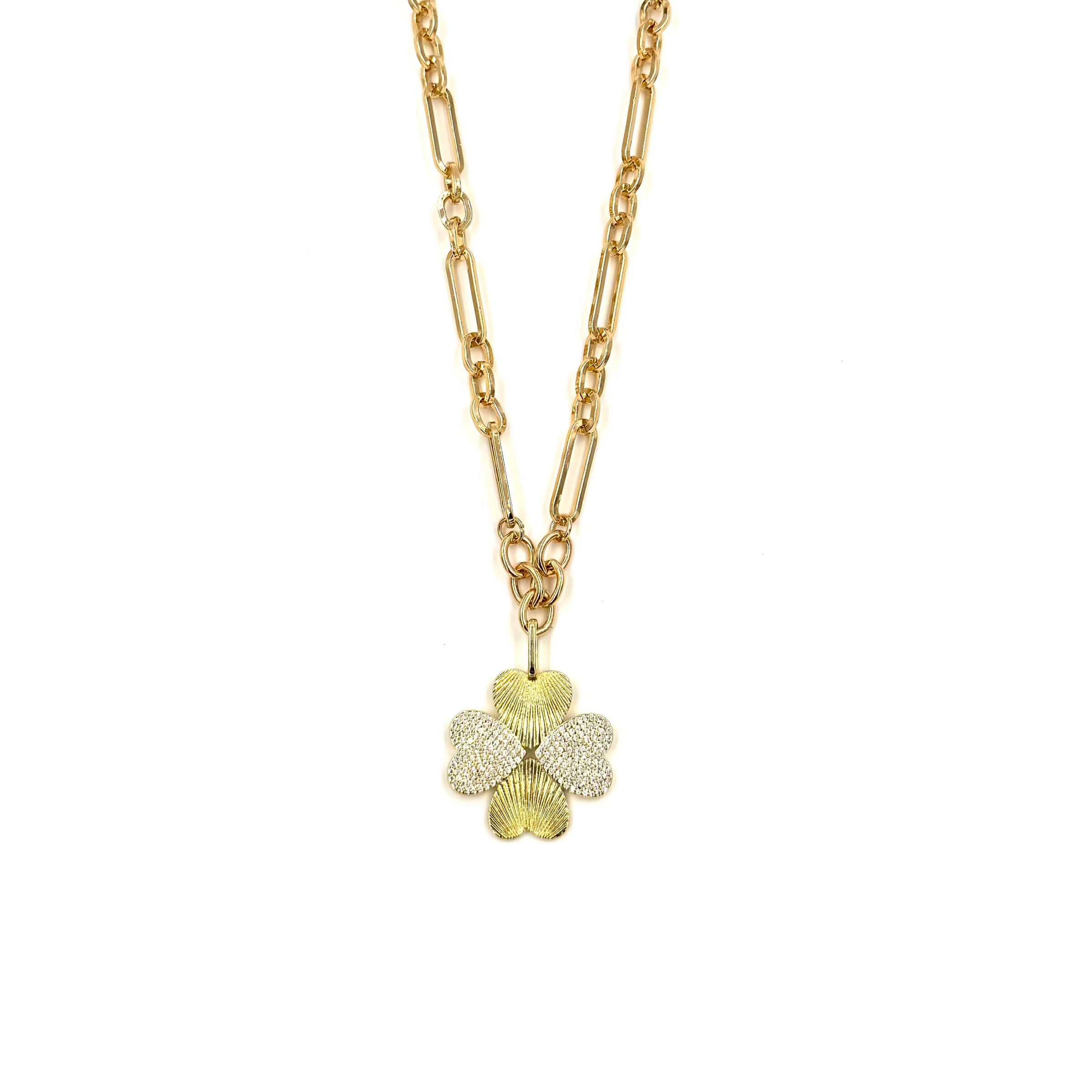 Ashley Gold Stainless Steel Gold Plated Paperclip Chain CZ Four Leaf Clover Pendant Necklace