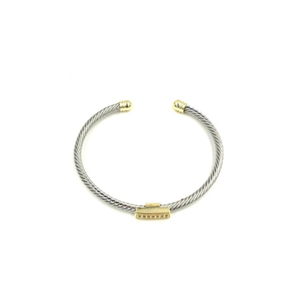 Ashley Gold Stainless Steel CZ Bar Two Toned And Twisted Rope Design Open Bangle Bracelet