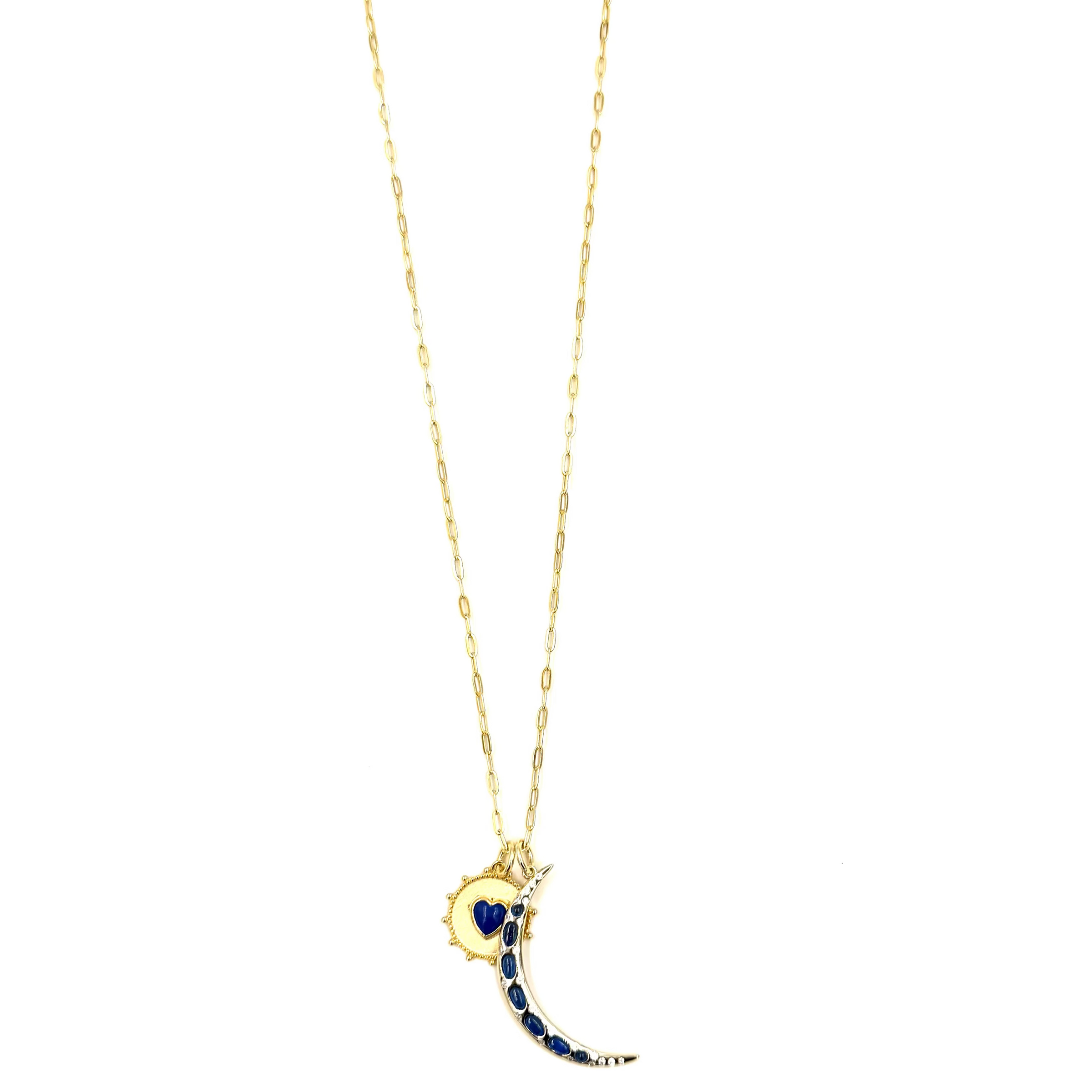 Ashley Gold Sterling Silver Gold Plated Paper Clip Link Chain With Disk and Moon Charm With Semi Precious Stones Necklace